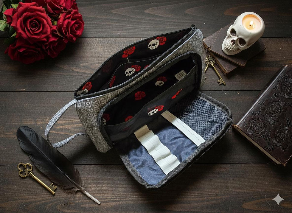 Features a large main top-zip section and a specialized side-zip flap for high-use items, and elastic loops to keep pens, brushes, or medical tools from rolling around.
